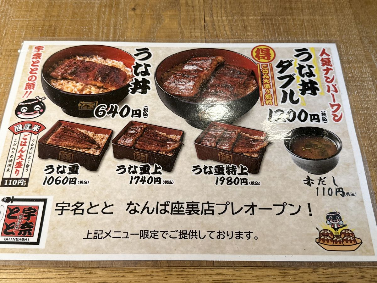 『名代 宇奈とと なんば座裏店』では、上記写真のメニューが提供されています。