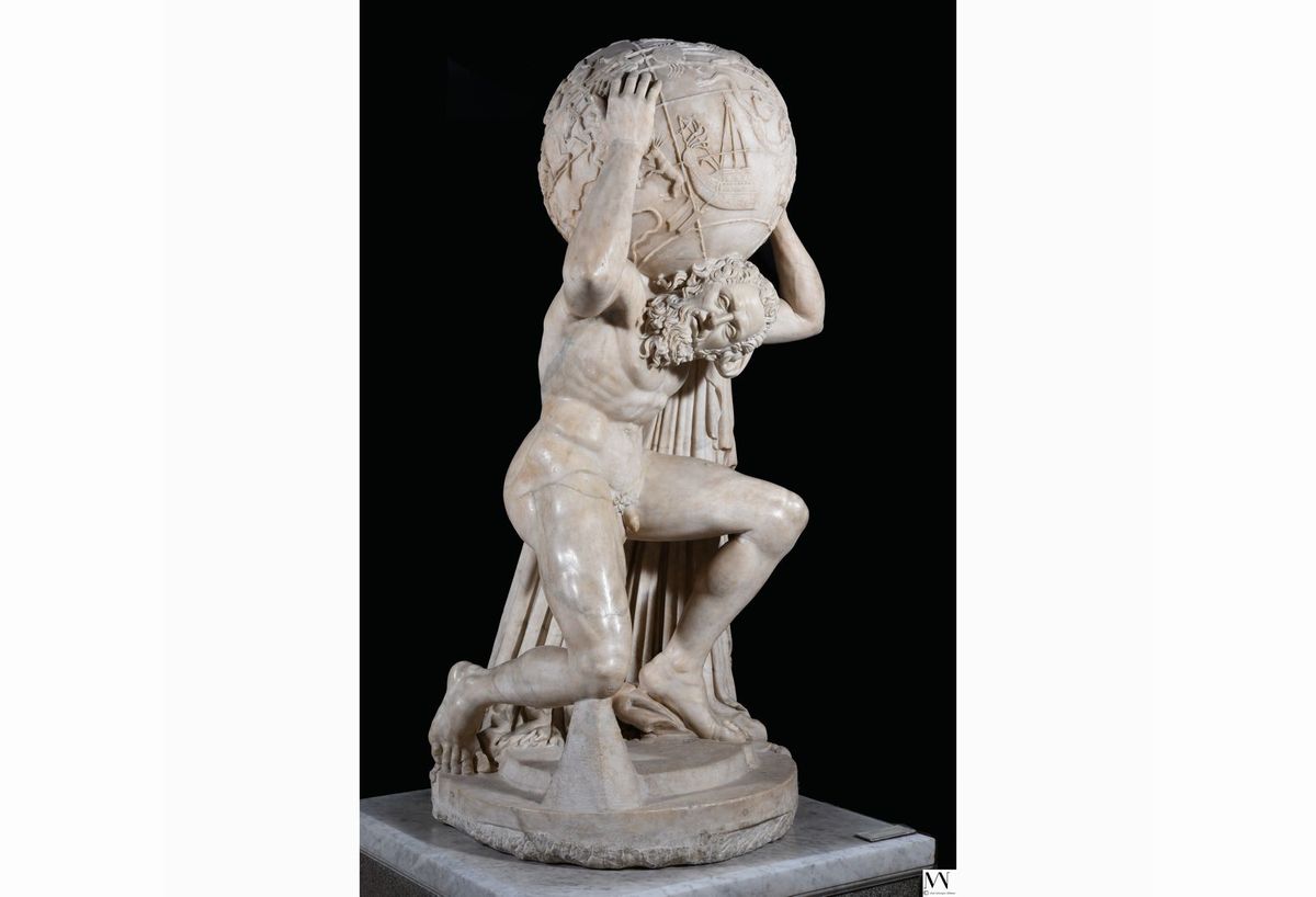 こちらの作品は、大阪・関西万博イタリアパビリオンで展示されていた神話の巨人アトラスをかたどった大理石彫刻となっており、天球には星座や黄道十二宮も刻まれ古代彫刻の洗練さを伝える石像です。