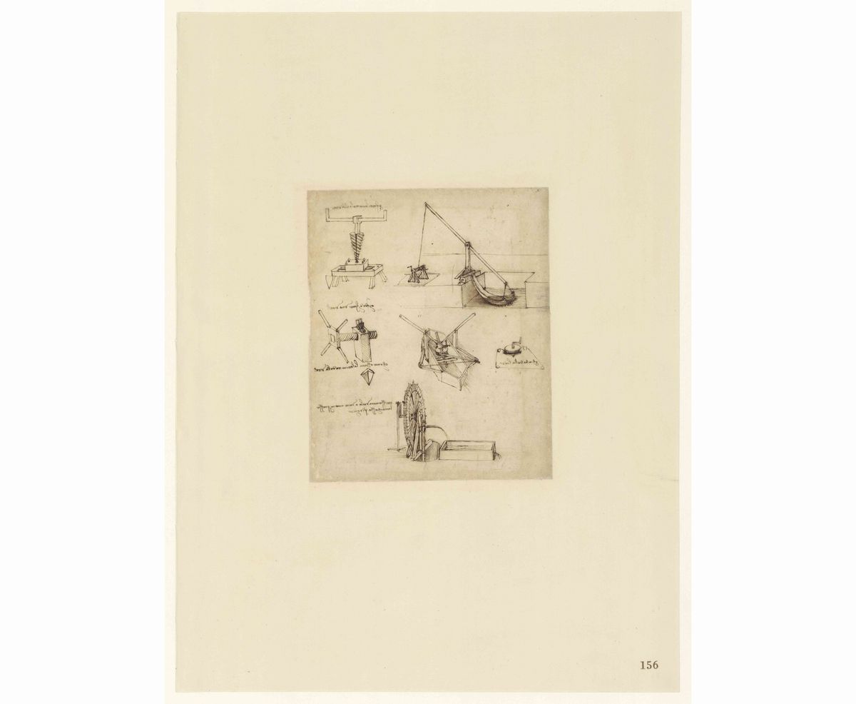 レオナルド・ダ・ヴィンチ『アトランティコ手稿』第156紙葉 表《水を汲み上げ、ネジを切る装置》1480-1482年頃 アンブロジアーナ図書館(C)Veneranda Biblioteca Ambrosiana/Metis e Mida Informatica/Mondadori Portfolio.(提供画像)