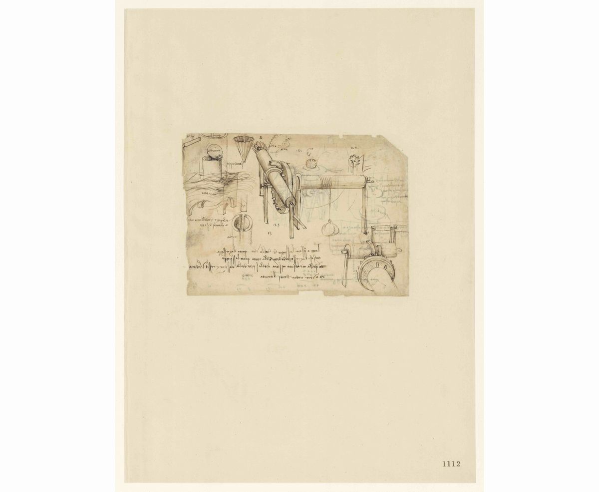 レオナルド・ダ・ヴィンチ『アトランティコ手稿』第1112紙葉 表《巻き上げ機と油圧ポンプ》