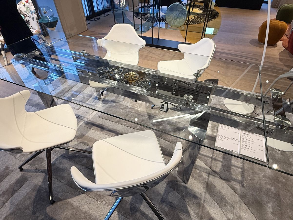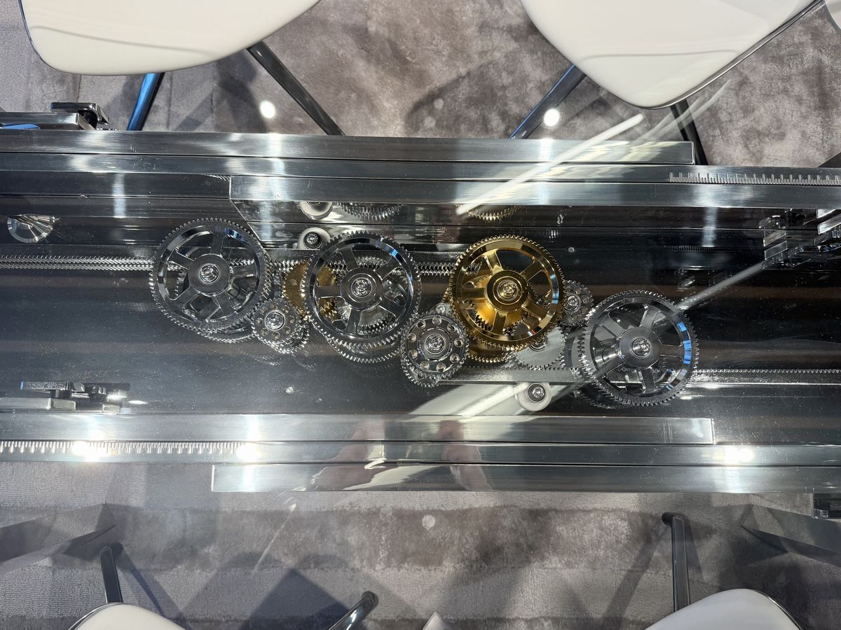 ガラスのテーブル内には歯車が内蔵されており、テーブルの伸縮中に回転し、レトロな機械音を聴くことができます。
