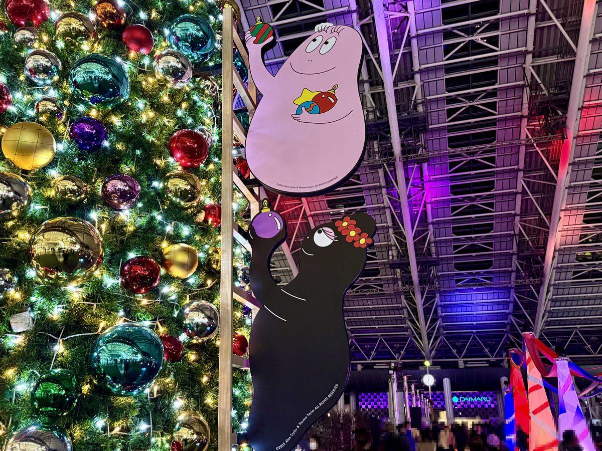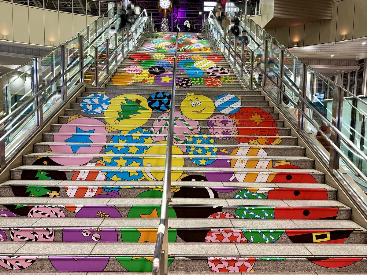 こちらは大階段装飾『Ornament rush!』で、バーバパパファミリー扮するオーナメントのイラストが描かれた階段装飾となっています。