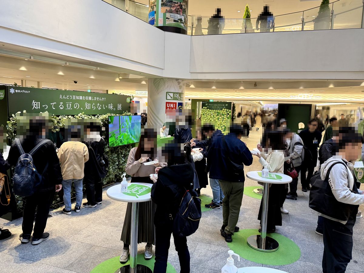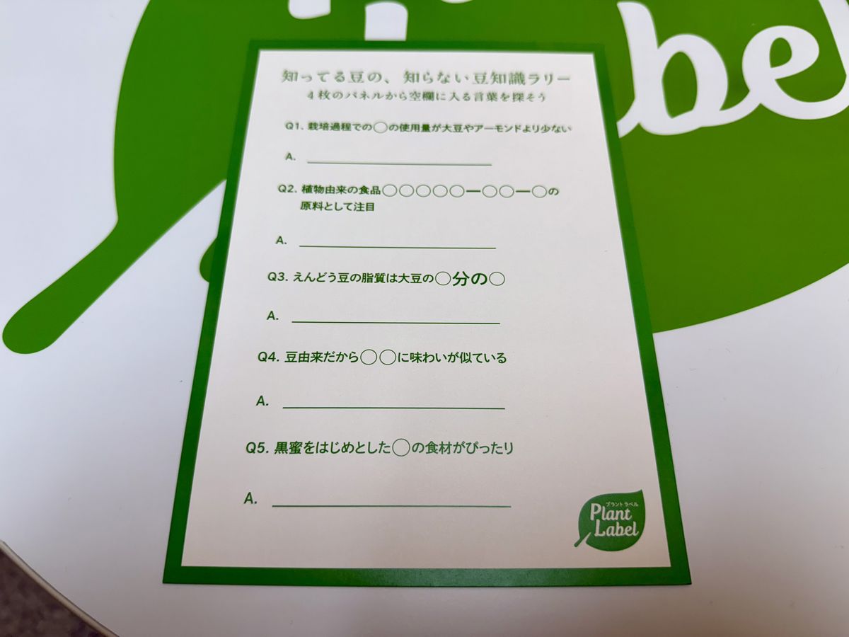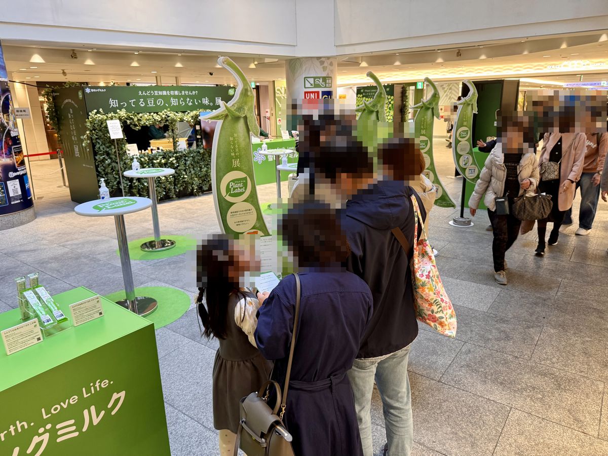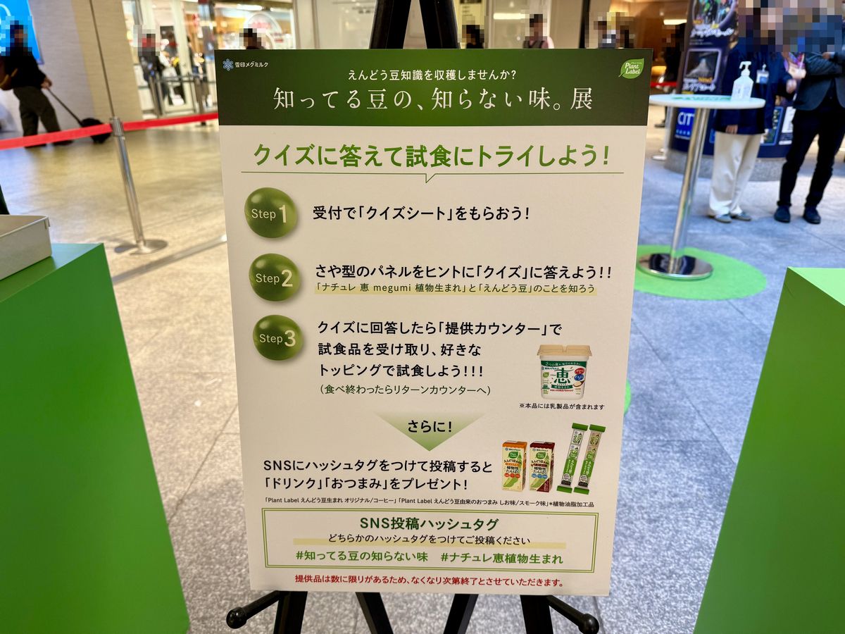 「知ってる豆の、知らない味。展」は、植物由来の食品ブランド「Plant Label(プラント ラベル)」を展開する雪印メグミルク株式会社が主催となっており、えんどう豆を主原料にしたクイズに挑戦し、回答するとプラントベース食品の試食ができるポップアップイベントです。