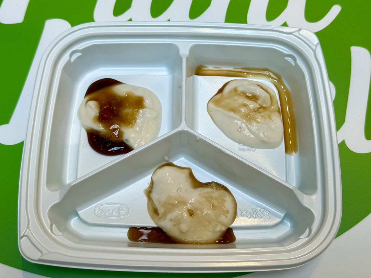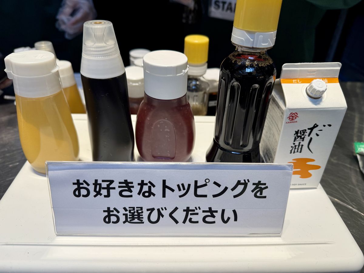 試食の際、だし醤油・ポン酢・イチゴジャム・黒蜜・蜂蜜の中から、3種類のトッピングを選ぶことができます。