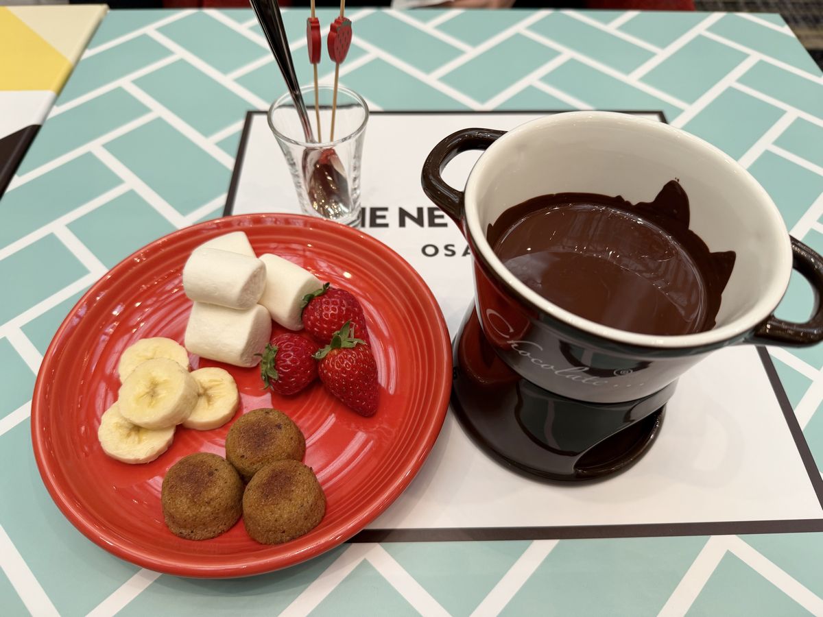 こちらは『チョコレートフォンデュ』で、いちご、バナナ、マシュマロ、フィナンシェを濃厚なチョコレートとともに味わえるフォンデュとなっています。