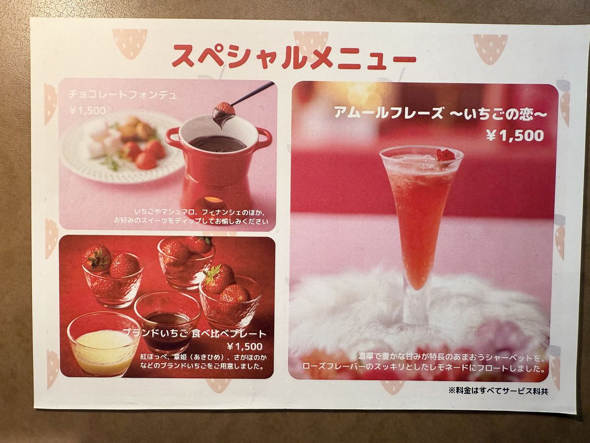 またスペシャルメニューとして、『チョコレートフォンデュ』『ブランドいちご 食べ比べプレート』『アムール フレーズ ~いちごの恋~』も用意されています。