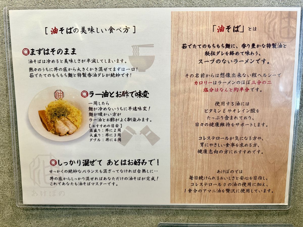 店内の壁に『油そばの美味しい食べ方』と書かれた解説書が貼られています。