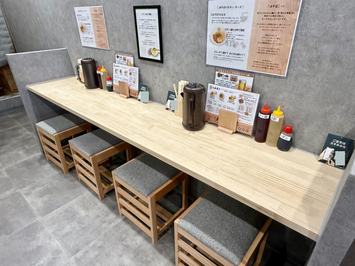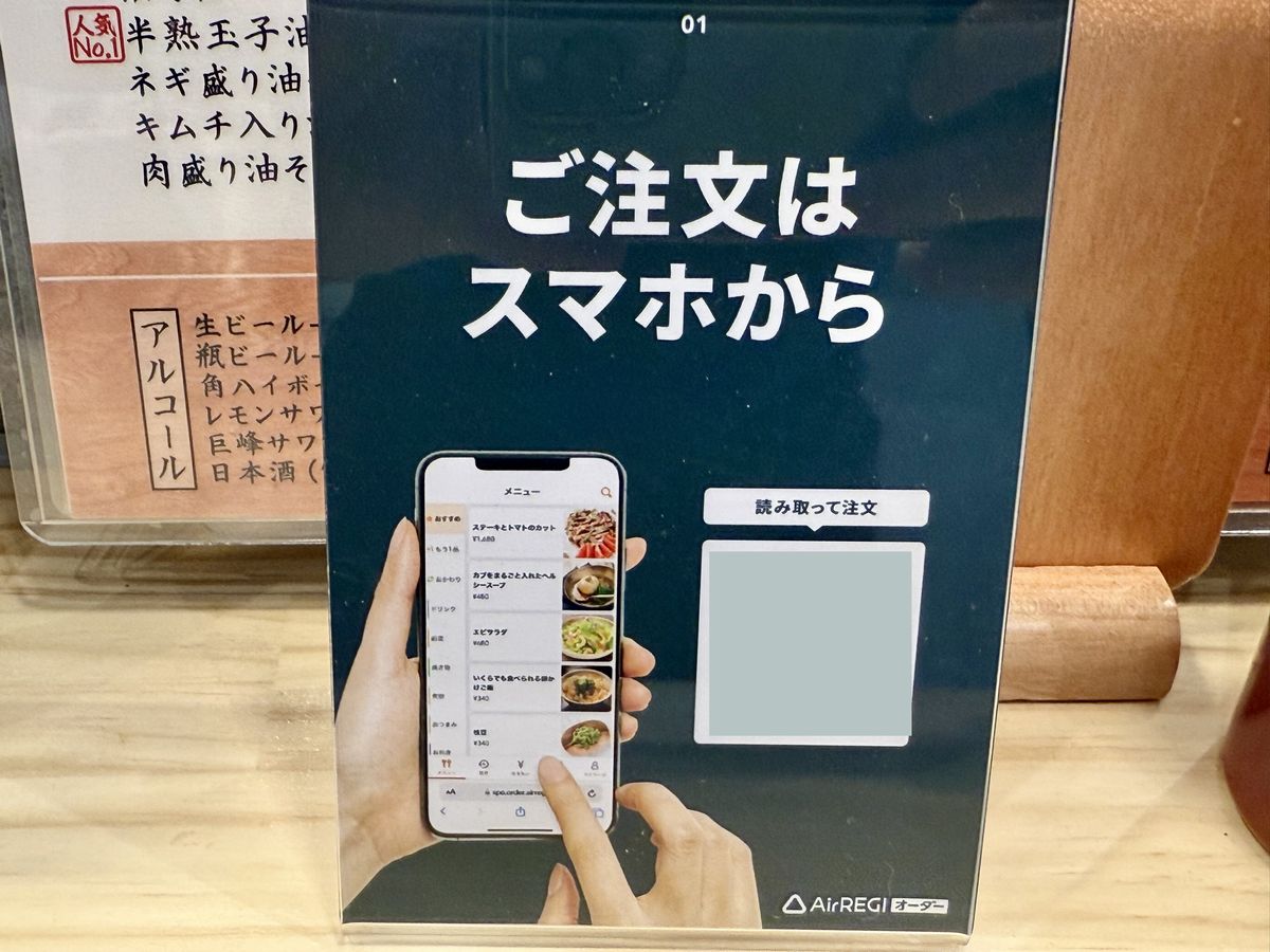 『油そば あけぼの 海遊館・大阪港店』では、各カウンター席・テーブル席に置かれているQRコードをスマホで読み込み、スマホから注文するシステムになっています。