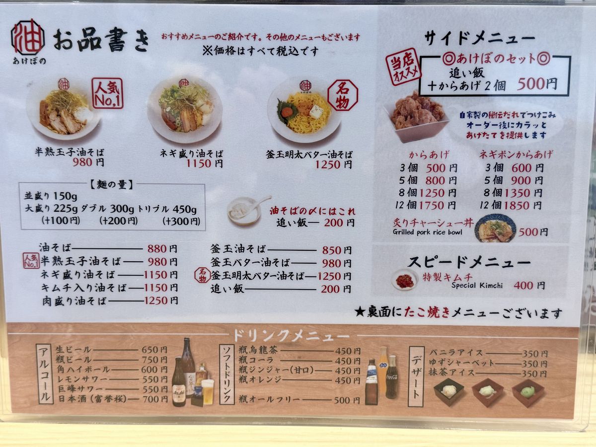 こちらが『油そば あけぼの 海遊館・大阪港店』のメニューです。