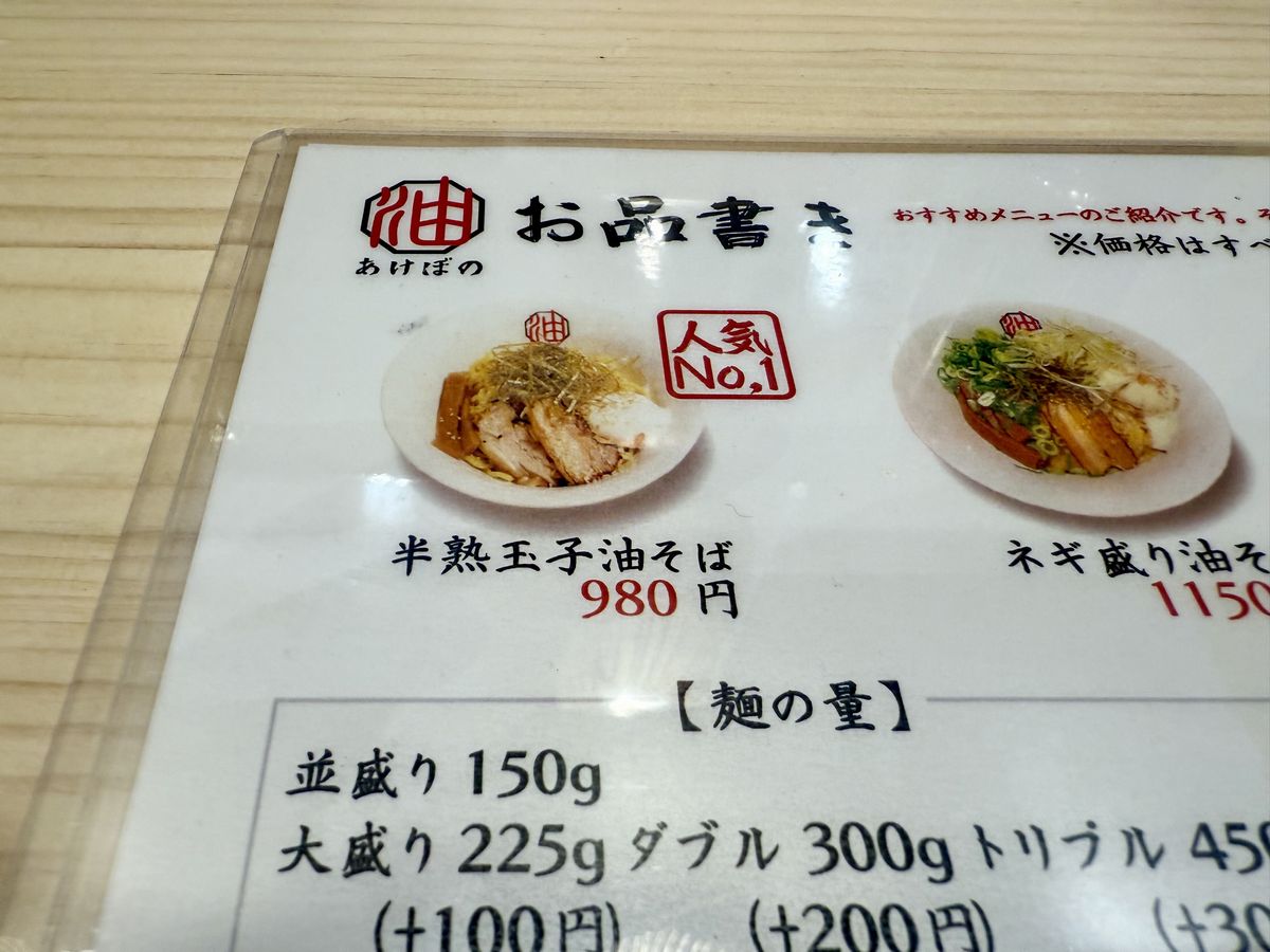 メニューにも記載されていますが、『半熟玉子油そば』は人気No.1のメニューのようです。