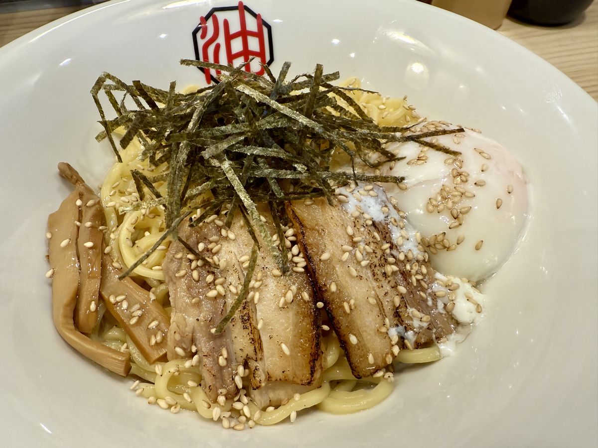 『半熟玉子油そば』には、チャーシュー、メンマ、刻み海苔、白ごま、半熟玉子がトッピングされています。