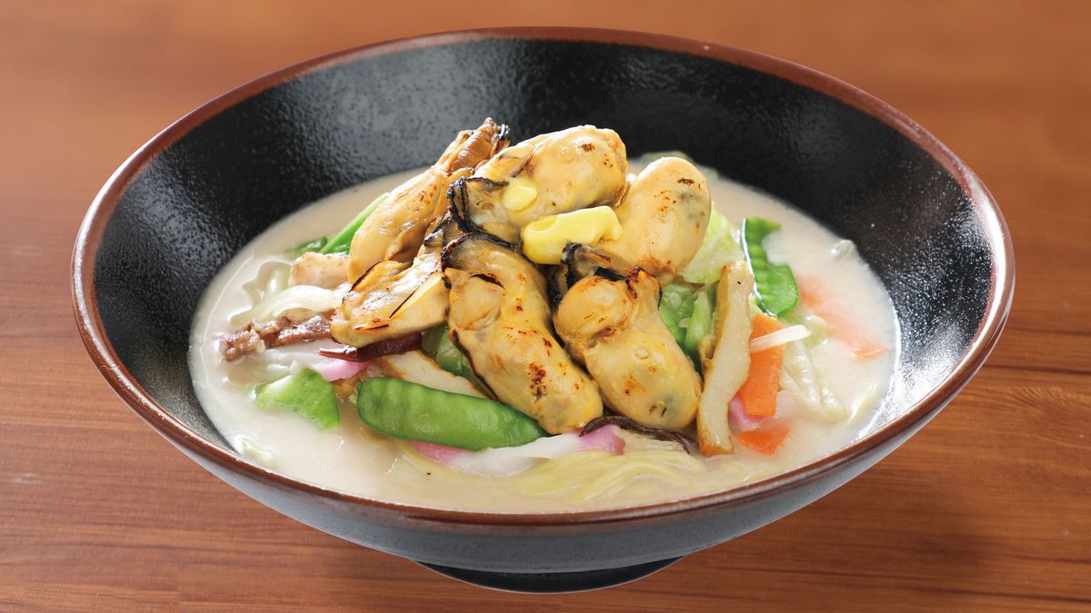 『牡蠣ちゃんぽん』は、たっぷりの野菜と一緒にトッピングされた広島県産の牡蠣を存分に味わえるちゃんぽんです。
