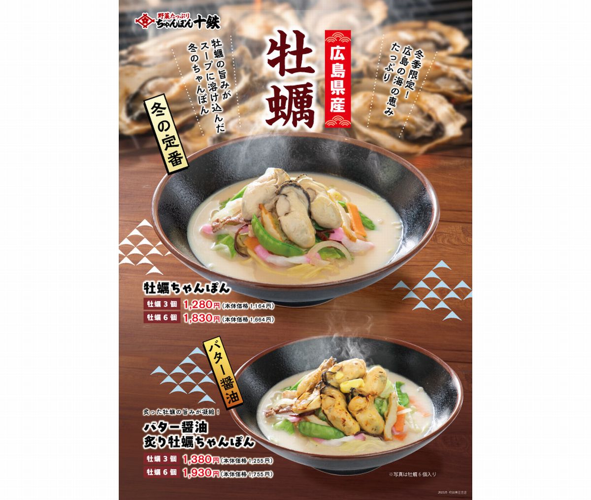 いただいた情報によると、大阪市東住吉区矢田1丁目にある『長崎ちゃんぽん 十鉄 大阪東住吉店』で、2025年12月10日(水)から2026年2月28日(土)の期間限定で『牡蠣ちゃんぽん』と『バター醤油 炙り牡蠣ちゃんぽん』が登場中です!
