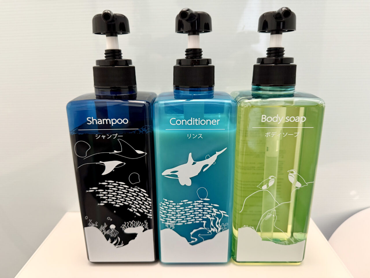 浴室に置かれているシャンプー・リンス・ボディソープのボトルにも、海の生き物のイラストが描かれています。