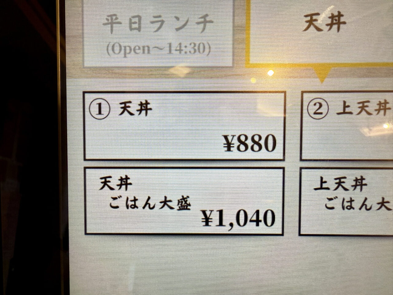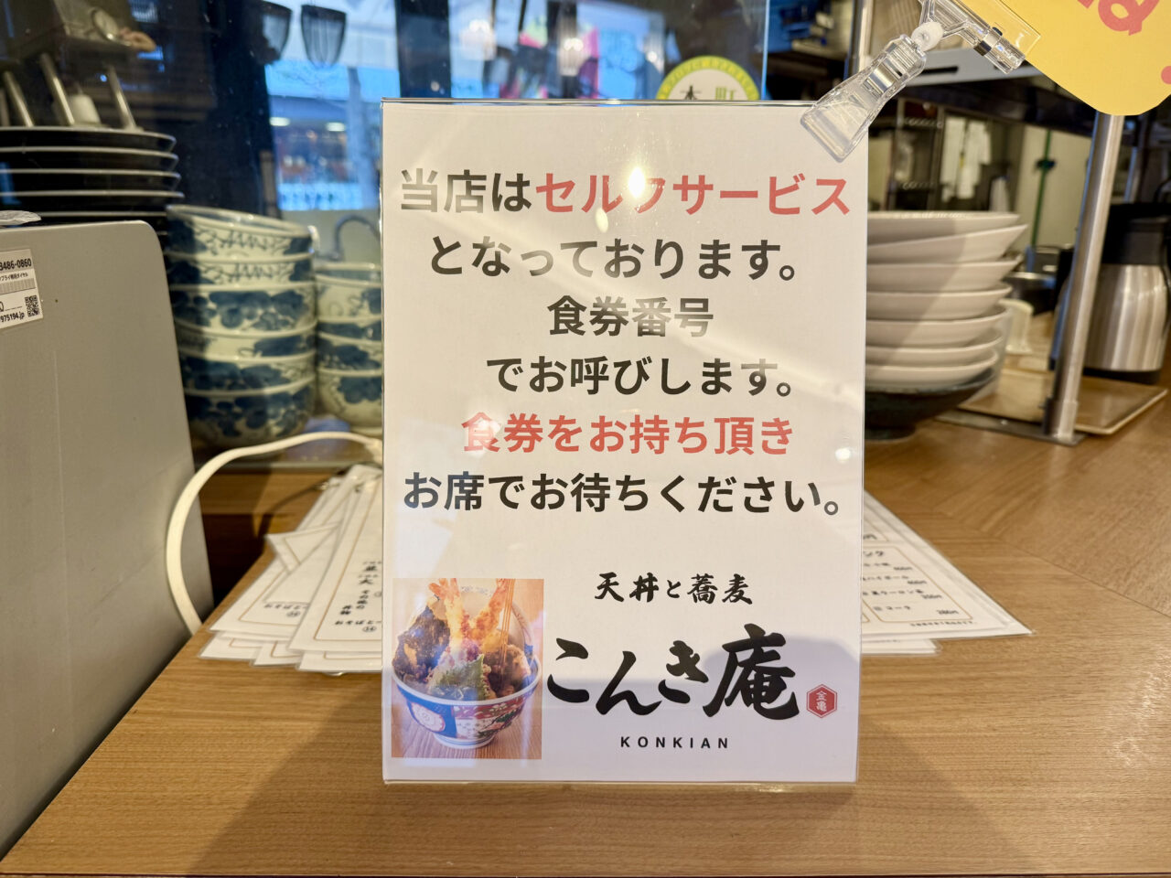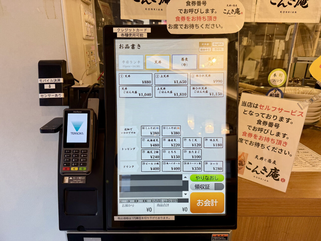 『天丼と蕎麦 こんき庵 本町店』では、事前に食券を購入するシステムになっています。
