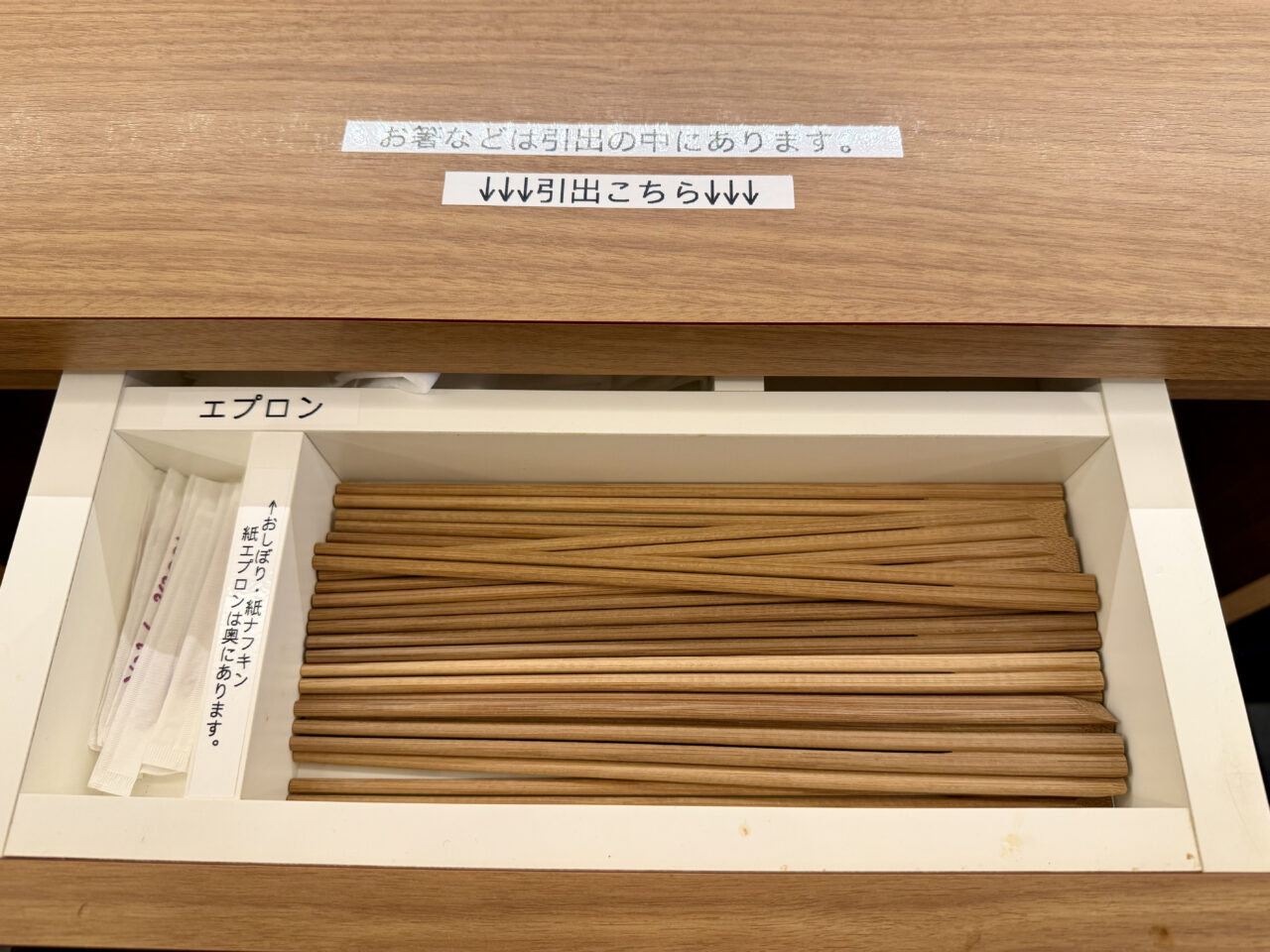 各カウンター席には引出があり、引出を引くとお箸や紙ナプキン、紙エプロンなどが入っています。
