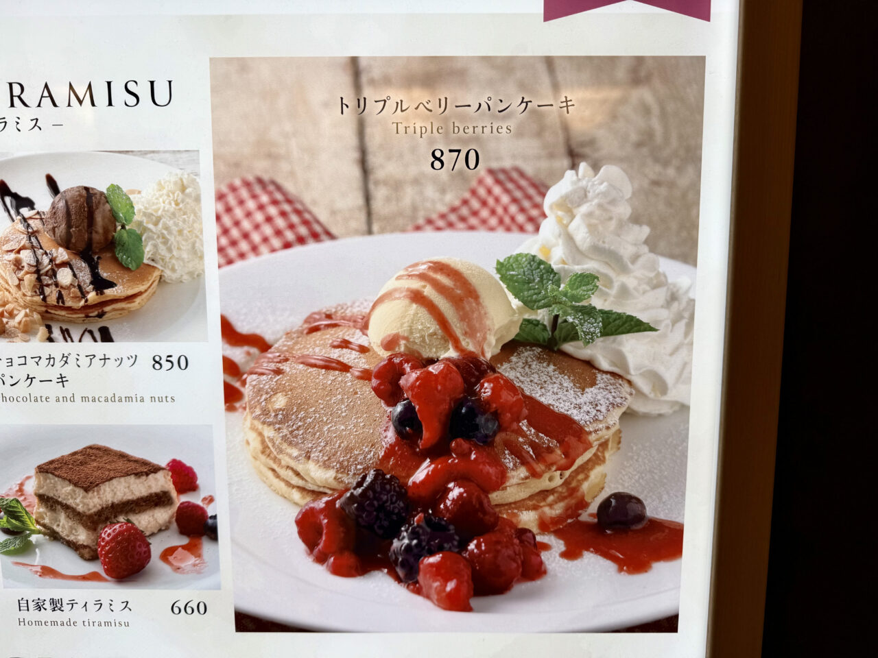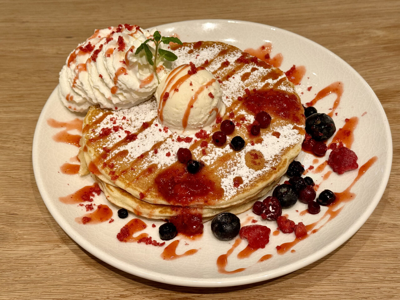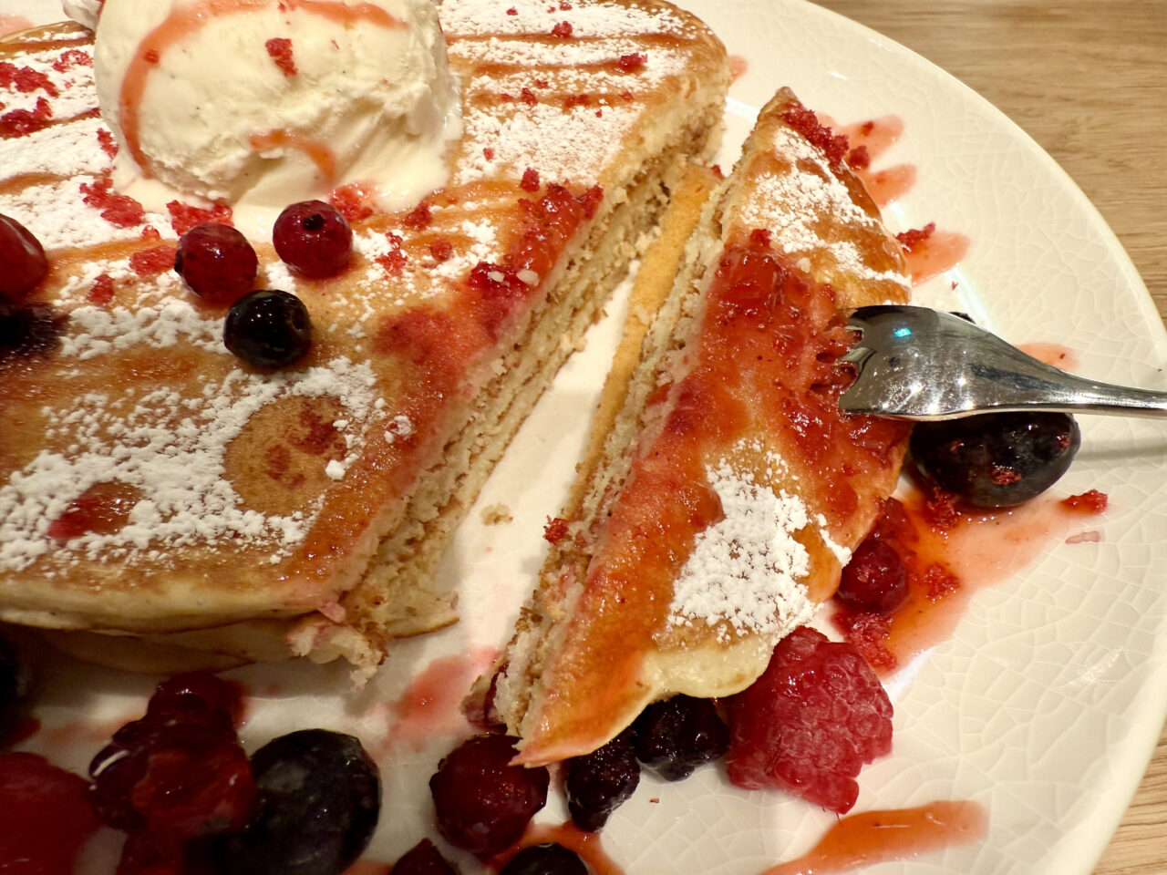 パンケーキもふんわりと厚みがあり、甘酸っぱいストロベリー・ラズベリー・ブルーベリーがたっぷりトッピングされており、甘さと酸味のバランスが絶妙でした。