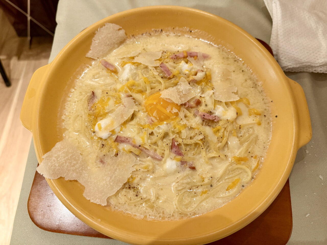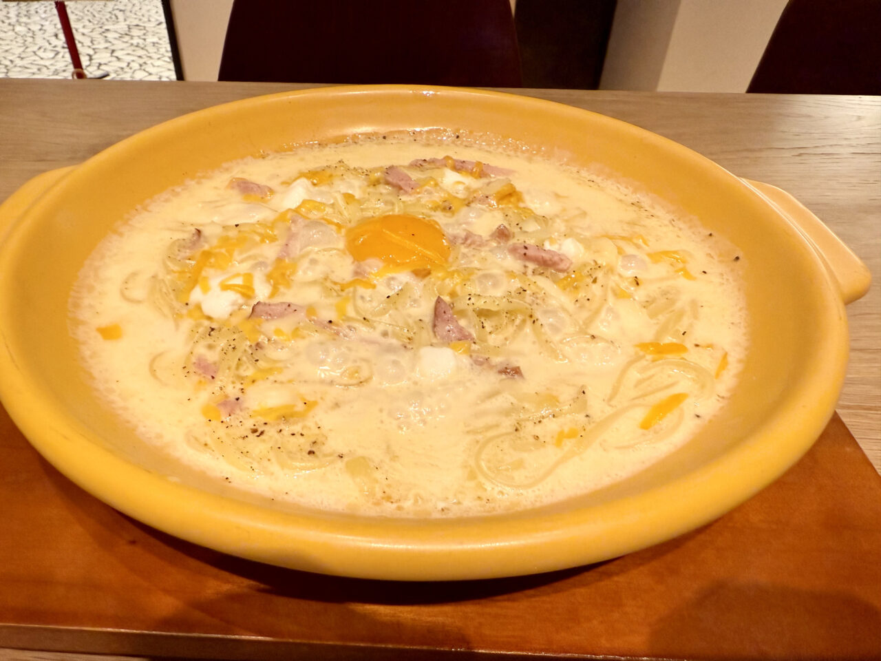 今回、看板メニューのひとつでもある『土鍋パスタ』の『とろける7種チーズのカルボナーラ』をいただきました。
