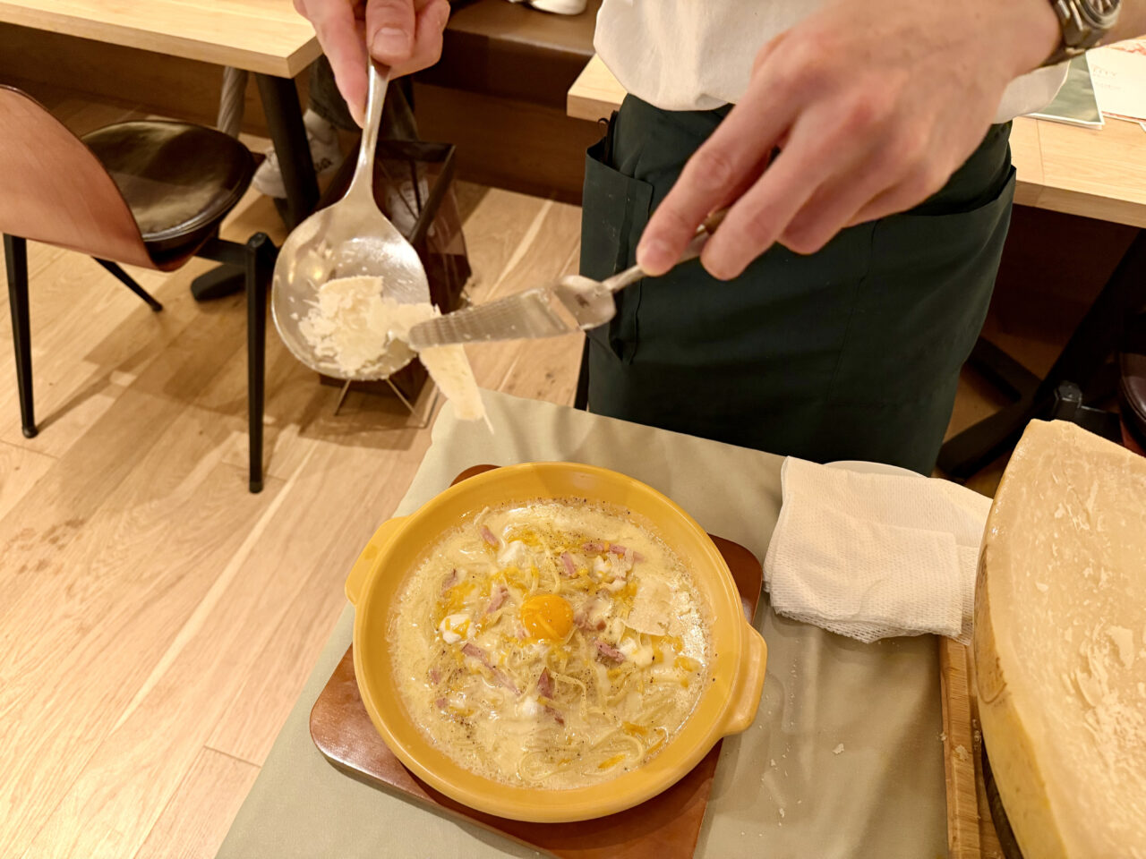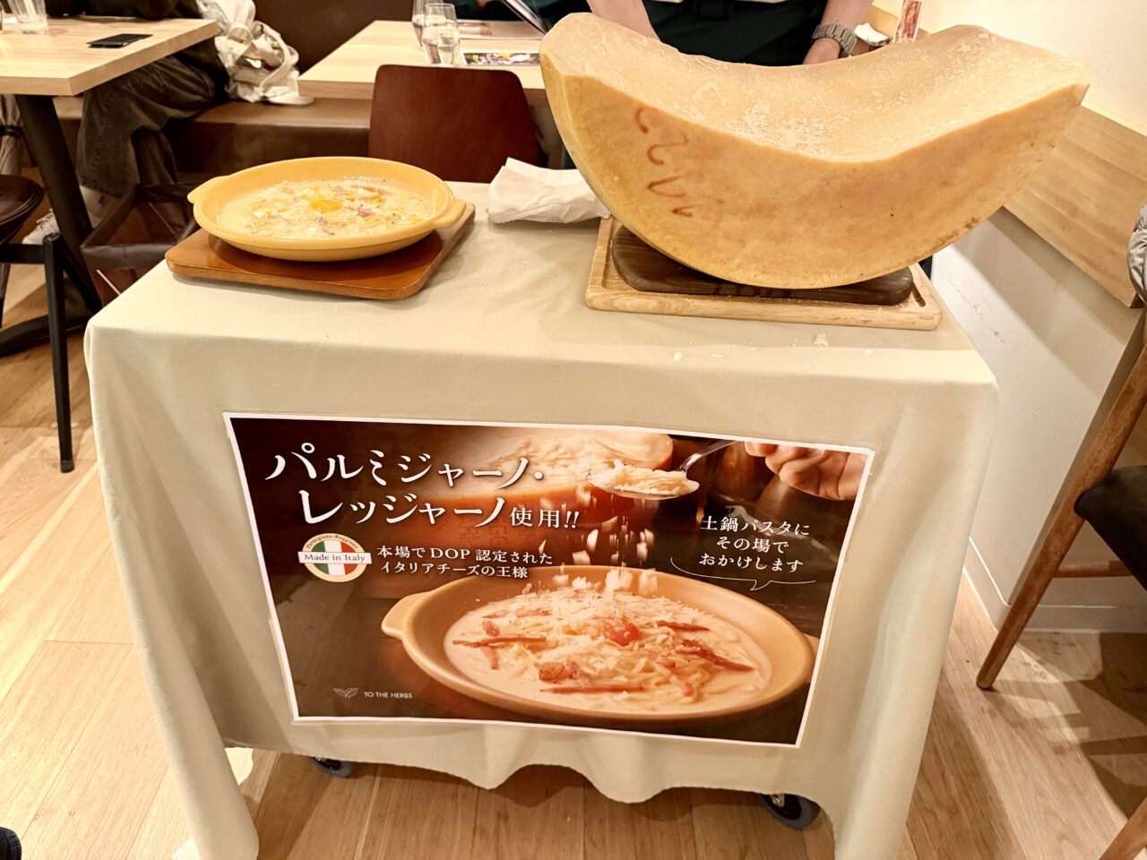 そして『土鍋パスタ』には、ワゴンサービスとして『パルミジャーノ・レッジャーノ』を目の前で削りトッピングとして仕上げてもらえます。