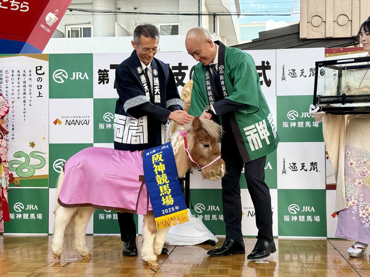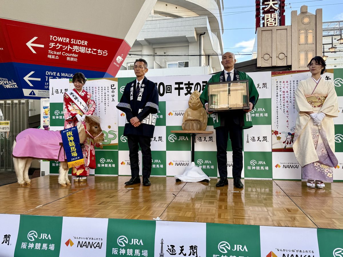 そして2025年干支・巳(へび)を代表して『通天閣』で1年間大切に育てられたコーンスネークの『ベーコン』と2026年干支・午(うま)を代表して阪神競馬場の人気アイドルでもあるポニーの『ふじこ』が対面します。