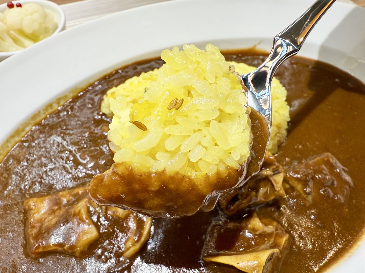ルーはまろやかでコクがありライスとの相性が良く、ほんのりとした甘みとスパイスがバランスよく感じられ、柔らかく煮込まれたビーフは噛むほどに旨みが口いっぱいに広がります。