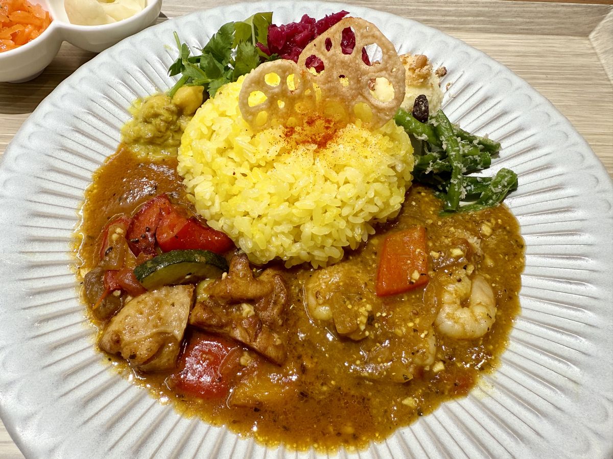 こちらが『スパイスカレー 合いがけ(チキンスパイス&エビマスタード)』で、チキンスパイスとエビマスタードの風味が豊かで、味のコントラストが楽しめます。