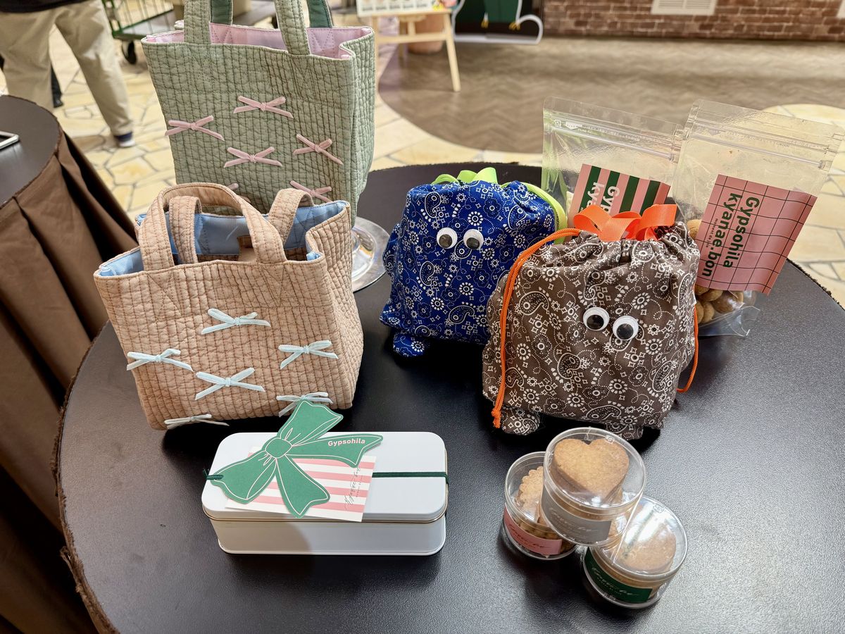 こちらは4階 コトコトステージ41で販売される『Gypsohila×kyanae.bon(ジプソフィア×キャナエボン)』で、『Gypsohila』の巾着やランチバッグと『kyanae.bon』のクッキーがセットになった商品です。