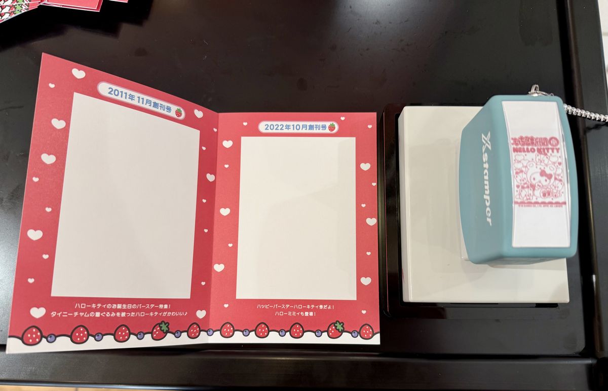 「ハローキティ」が表紙となった歴代の「月刊いちご新聞」が展示されています。