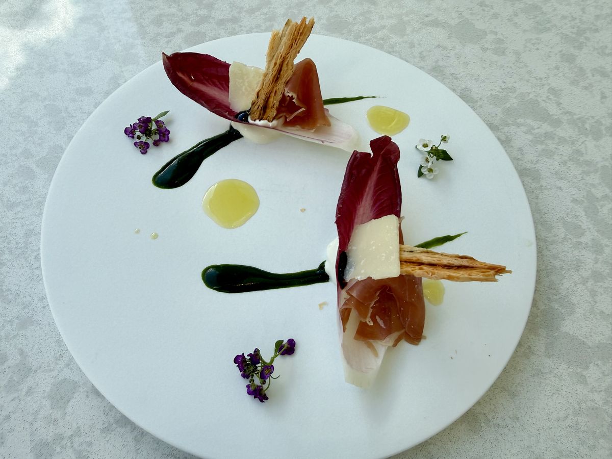 こちらはサラダの『アンディーブのサラダ 生ハム パルミジャーノチーズ エスプーマ バルサミコ』です。