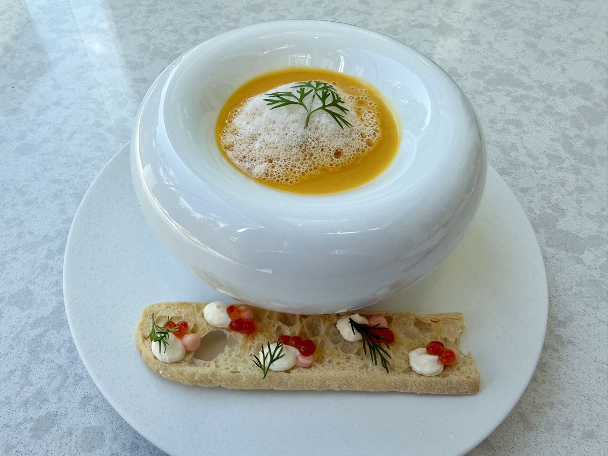 こちらはスープの『雪下人参のスープ スモークサーモンといくらのタルティーヌ添え』です。