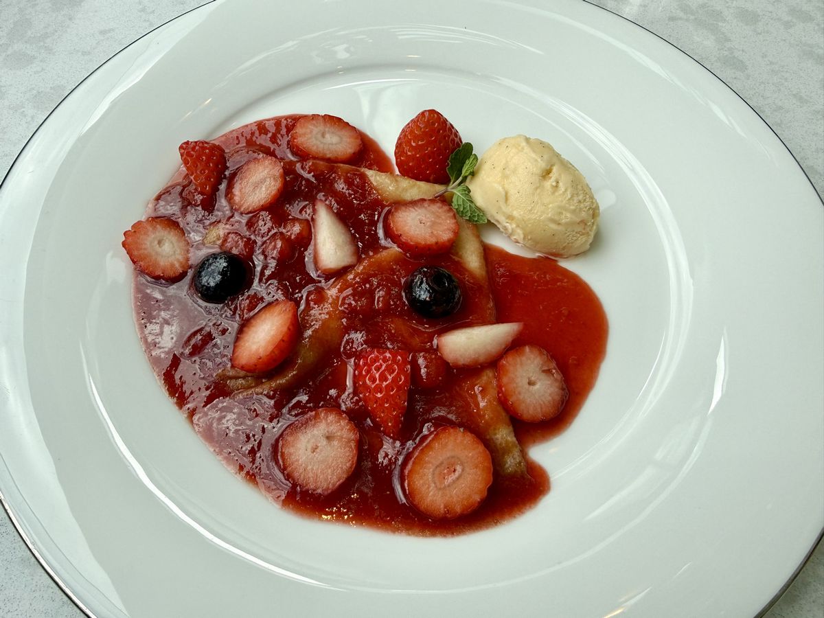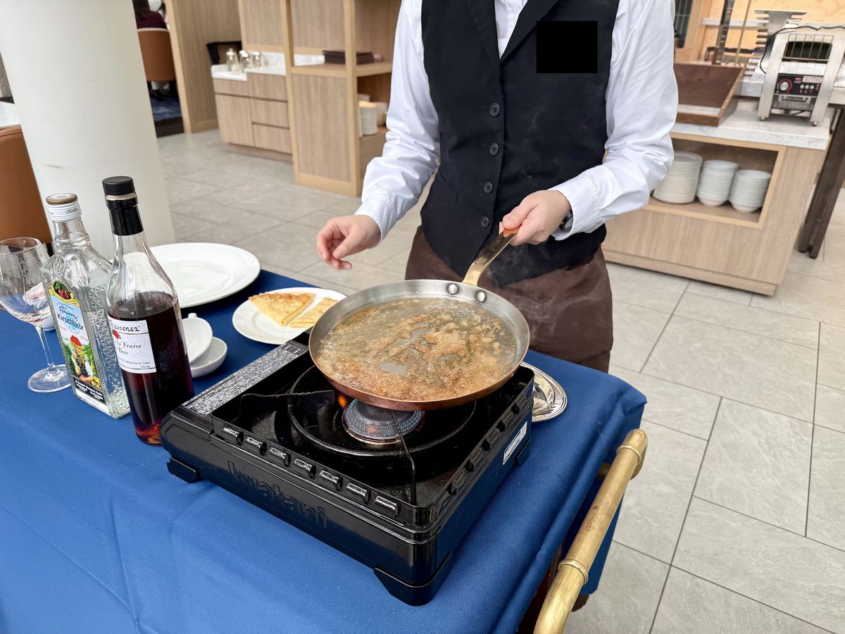 デザートの『いちごのクレープシュゼット』では、目の前で最後の仕立てを見ることができます!