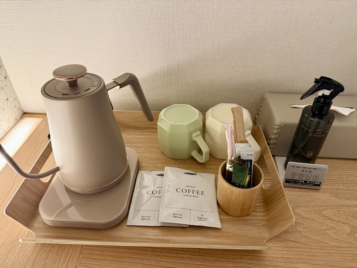 消臭スプレーや電気ケトルが完備されています。