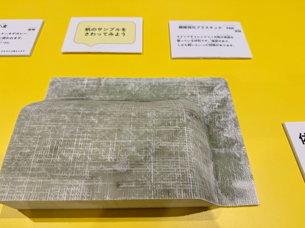 ウインドチャレンジャーの帆(ほ)のサンプルなどが展示されており、直接触れたり、映像を見て楽しむことができます。