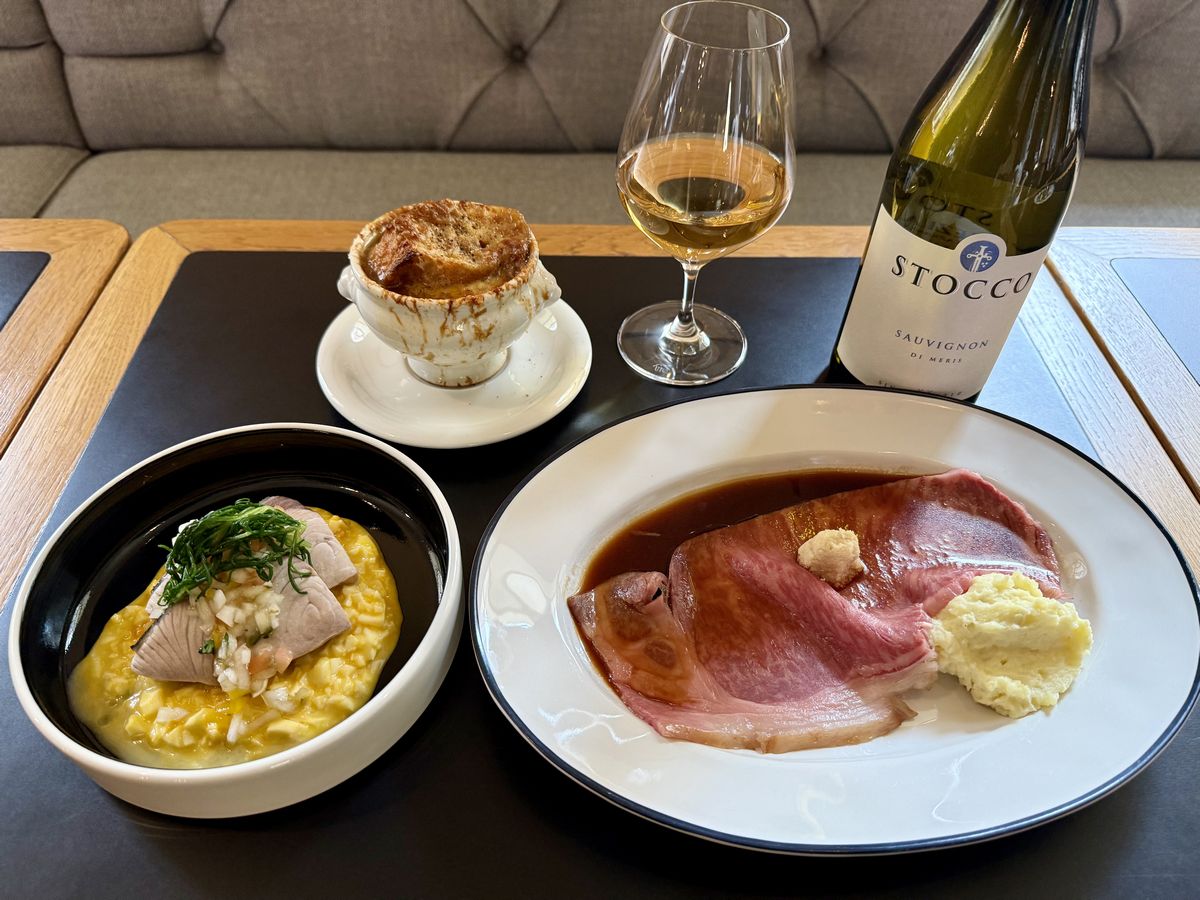 こちらはディナーメニューの『黒毛和牛サーロインのローストビーフ』『天然鰤のレッサート』『オニオングラタンスープ』の3品です。
