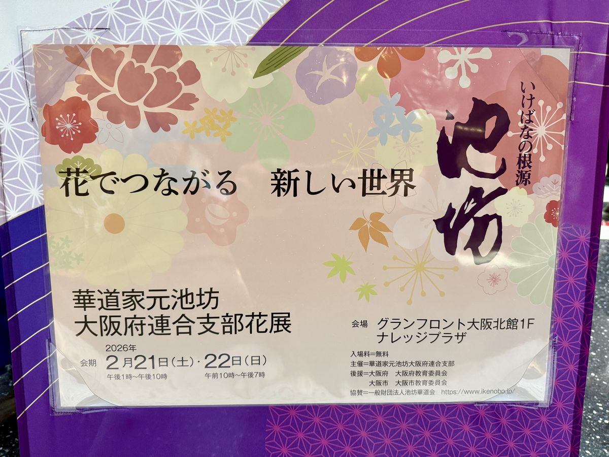 2026年2月21日(土)から22日(日)の2日間にかけて、『グランフロント大阪』北館1階ナレッジプラザにて『華道家元池坊 大阪府連合支部花展』が開催とのことで、今回初日となる21日(土)にお邪魔させていただきました!