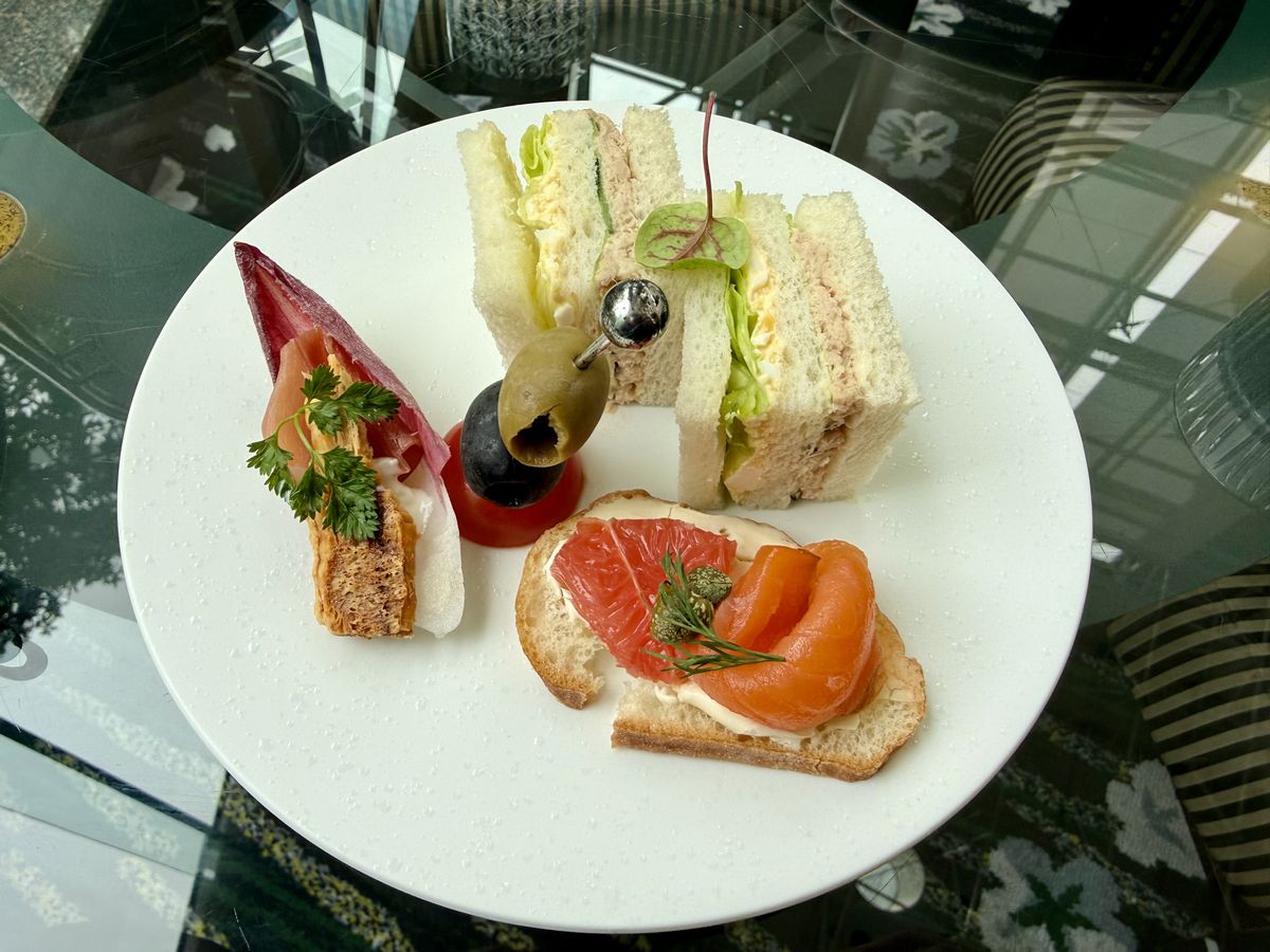 こちらはセイボリーで、ツナたまごサンドイッチ オリーブのブロシェット、アンディーブとパルメザンチーズのエスプーマ、自家製スモークサーモンとルビーグレープフルーツのカナッペが別皿でトッピングされています。