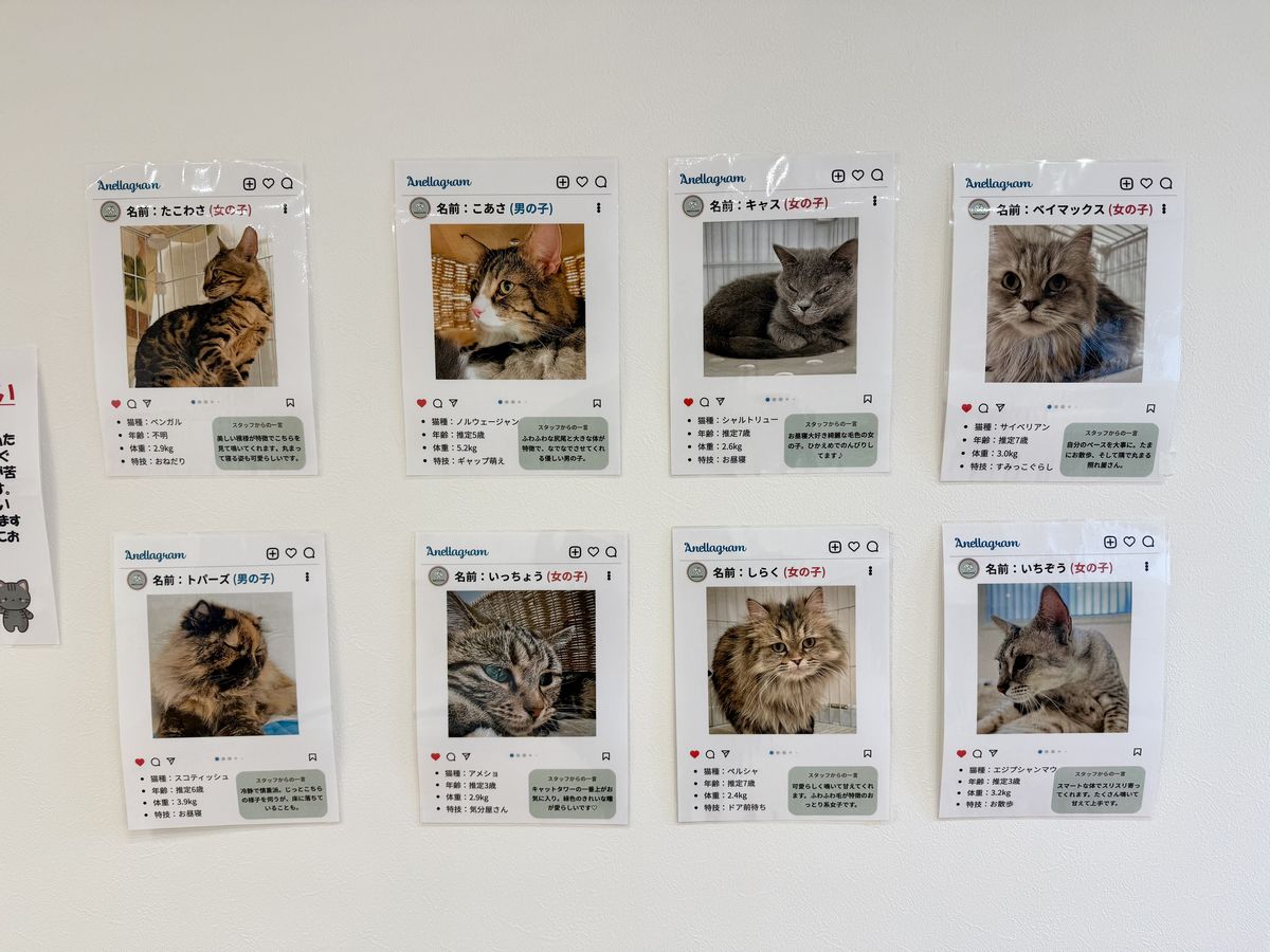 こちらの部屋には在籍しているねこちゃん達の顔写真とプロフィールが掲示されています。
