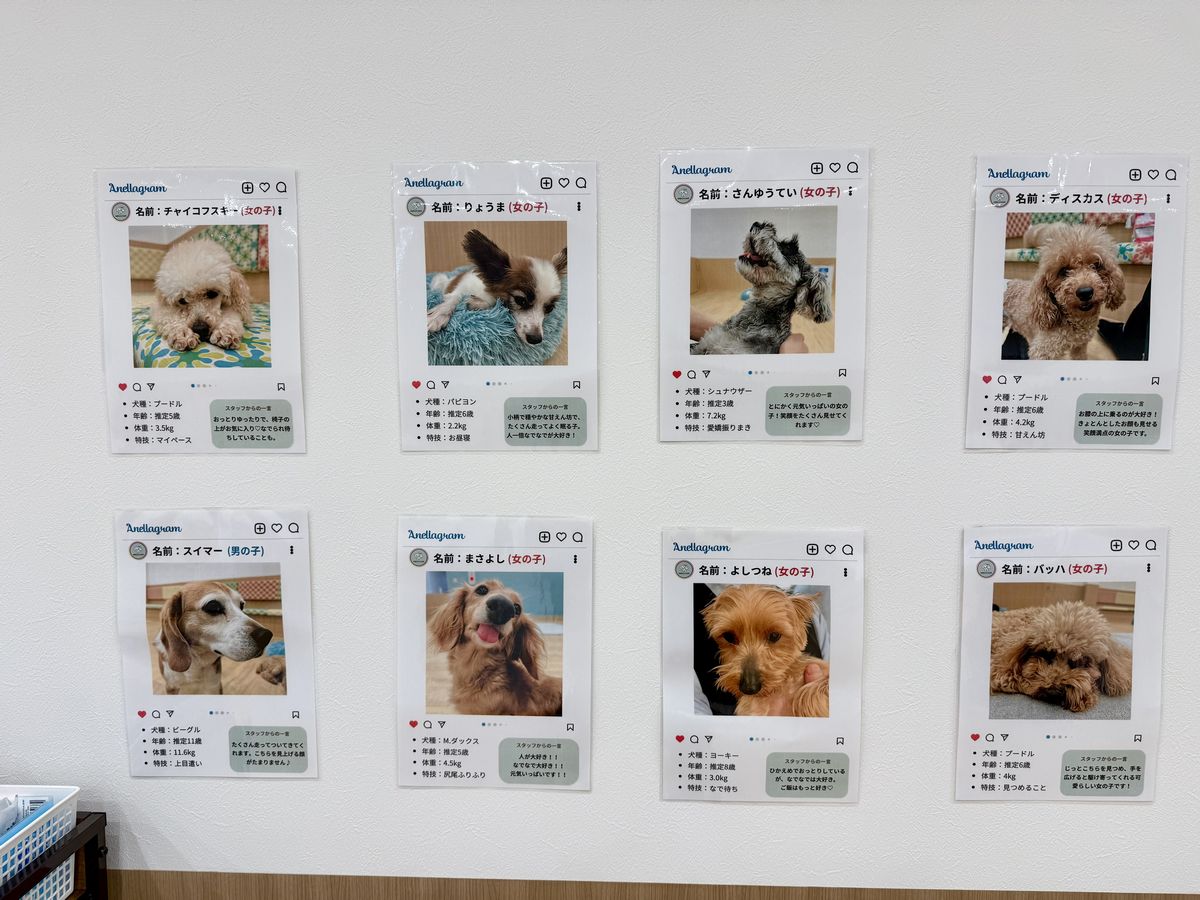 壁には在籍しているわんちゃん達の顔写真とプロフィールが掲示されています。