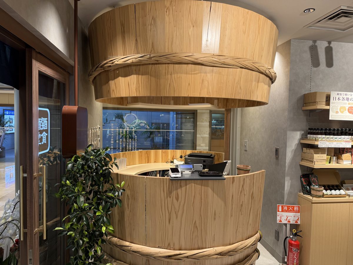 店内のレジカウンターは、万博会場の店舗で注目を集めた木桶席を設置しています。