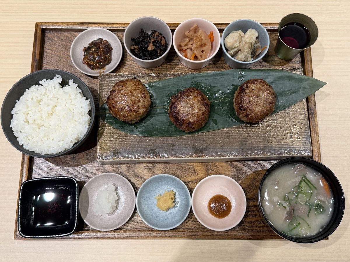 こちらが『淡路牛と淡路豚のハンバーグ定食 ~醤油や味噌と楽しむ至福プレート~』で、ハンバーグに食前酢・小鉢3種・豚汁・ご飯・漬物・発酵薬味が付いています。