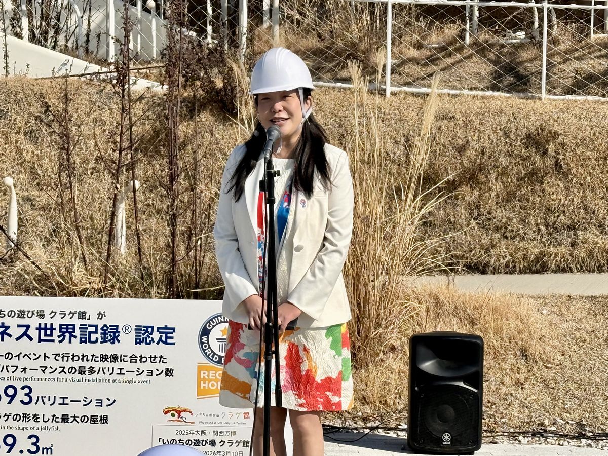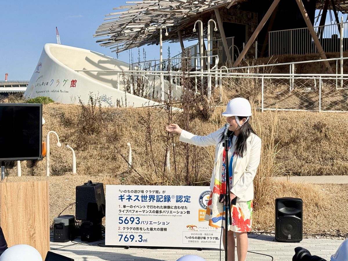 授与式では「いのちの遊び場 クラゲ館」プロデューサー・中島さち子さんが登壇し、「クラゲ館には、約268万人の方が訪れてくれました。今回認定された2つのギネス世界記録は、クラゲ館が大切にしてきた開かれた場と生きた協奏という価値を象徴するものだと受け止めています。」と挨拶をされていました。