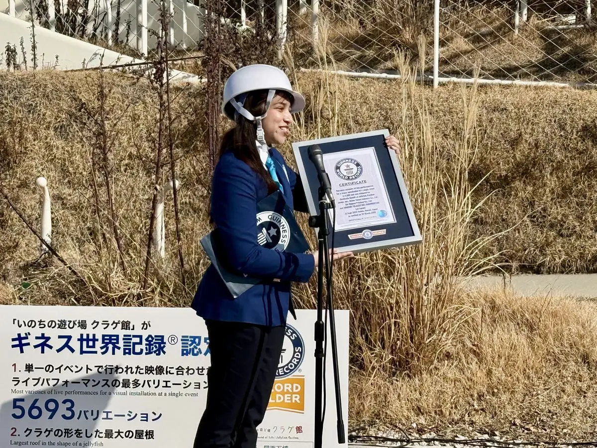 この度、「いのちの遊び場 クラゲ館」が「単一のイベントで行われた映像に合わせたライブパフォーマンスの最多バリエーション数」5693バリエーション、「クラゲの形をした最大の屋根」769.3平方メートルとして、ギネス世界記録に認定されました!