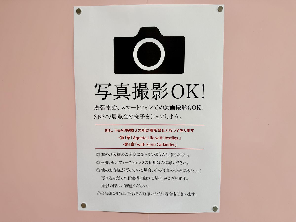 会場内の写真撮影はOKですが、第1章「Agneta-Life with textiles」と第4章「with Karin Carlander」は撮影禁止となっています。