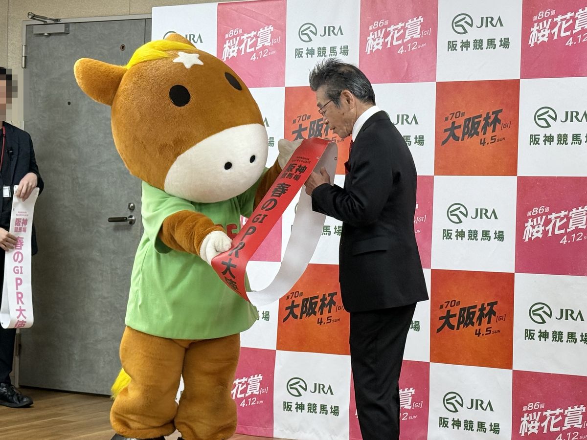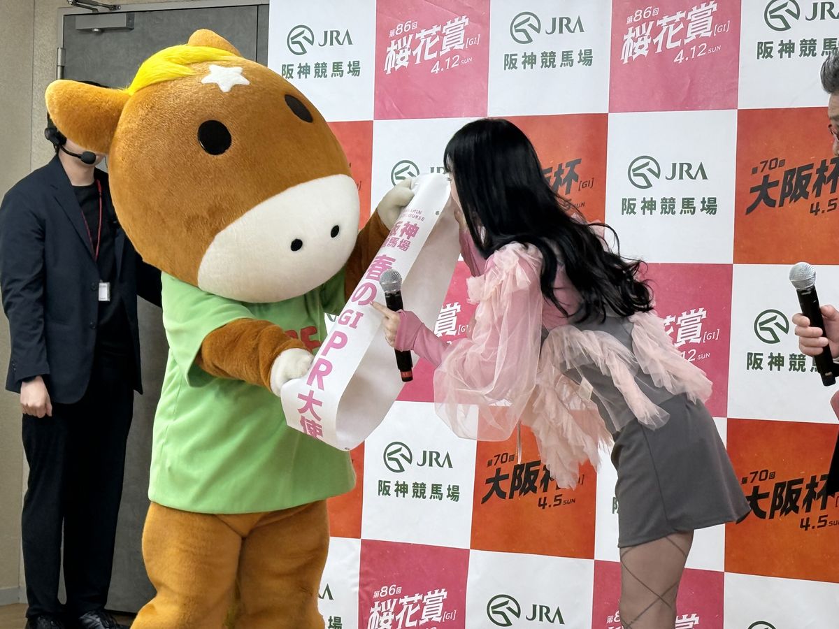 阪神競馬場 春のGI PR大使に就任ということで、ターフィーから襷(たすき)が授与されます。