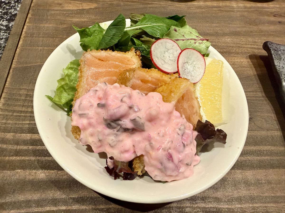 こちらはサーモンレアカツ柴漬けタルタルで、サーモンはしっとりやわらかく旨みをしっかり感じられ、タルタルソースのほどよい酸味を味わえる一品です。
