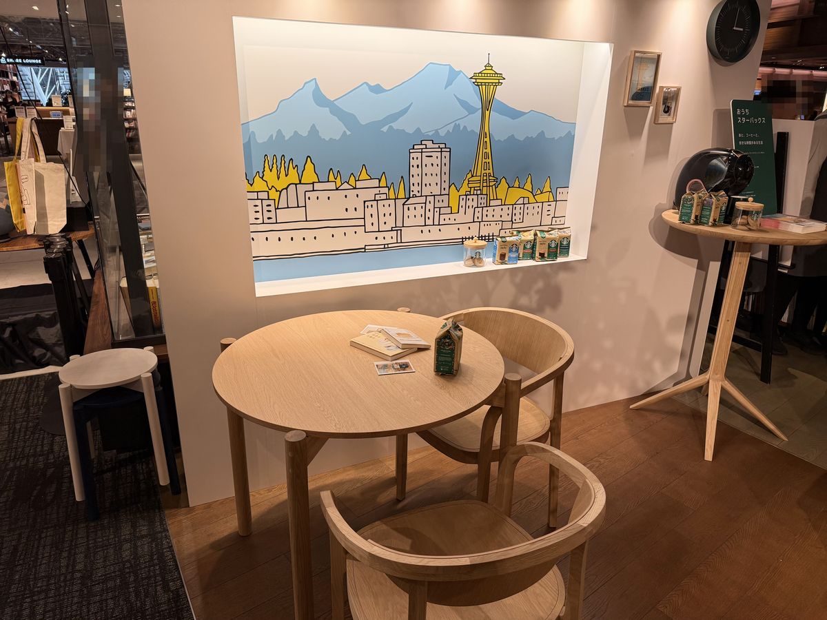 こちらのブースではリビングや書斎をイメージしたテーブルやイスが設置されており、担当の方の説明によると、背景のイラストはスターバックス コーヒーの1号店でもあるシアトルの風景が描かれているそうです。